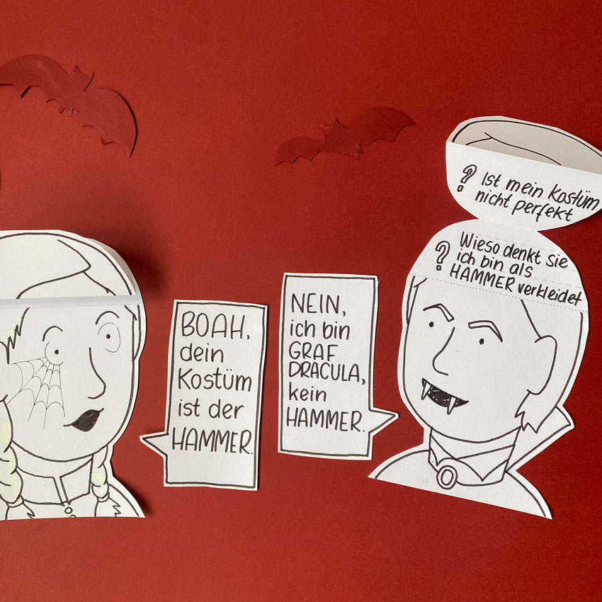 Überall lauern Missverständnisse. Auch an Halloween nimmt Hans Annas Kompliment ziemlich wörtlich. Mit unserem methodischen Material zum Sammeln, Ordnen und Ableiten von sozialem Wissen „Alles eine Frage der Sichtweise“ werden Situationen sichtbar und verständlich visualisiert. Mit Sprech- und Denkblasen könnt ihr Dialoge selbst gestalten, eintragen und gemeinsam Gesprächsregeln ableiten.